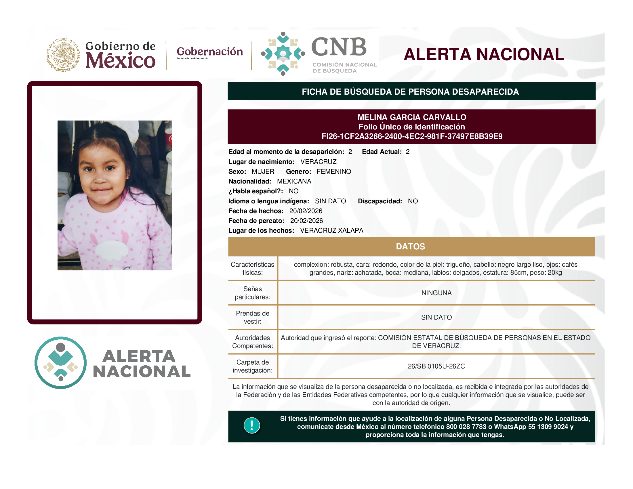 En este sitio web se encuentran disponibles las Alertas Nacionales vigentes de Búsqueda, Localización e Identificación de Personas Desaparecidas y No Localizadas, emitidas en las diversas entidades federativas del país, ante la noticia, reporte o denuncia de una Persona Desaparecida o No Localizada.